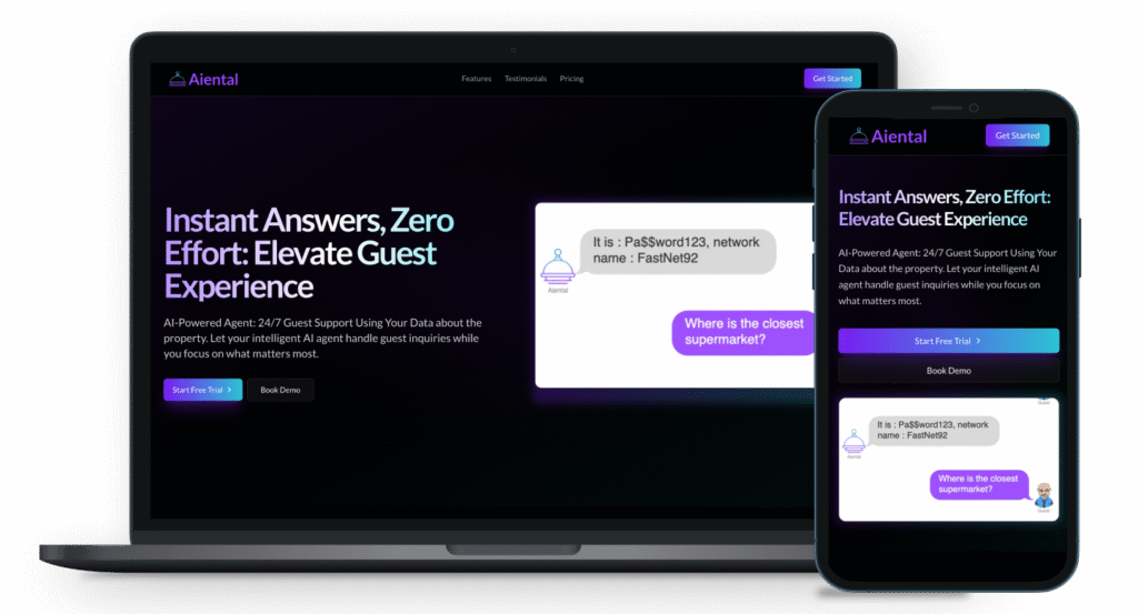 Aiental oferuje wsparcie dla gości 24/7, wykorzystując dane dotyczące Twojej nieruchomości. Inteligentny agent AI zarządza zapytaniami gości, dając gospodarzom więcej czasu na to, co naprawdę ważne.