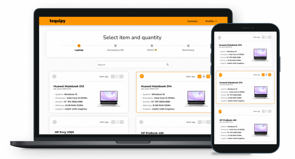 Tequipy to platforma specjalizująca się w outsourcingu logistyki sprzętu IT. Umożliwia zespołom wyposażenie się niezbędnymi urządzeniami, eliminując problemy związane z wysyłką, konfiguracją, odbiorem, magazynowaniem oraz wsparciem technicznym. Obecnie znajduje się wśród 5 najszybciej rozwijających się startupów w UE (według Forbes).